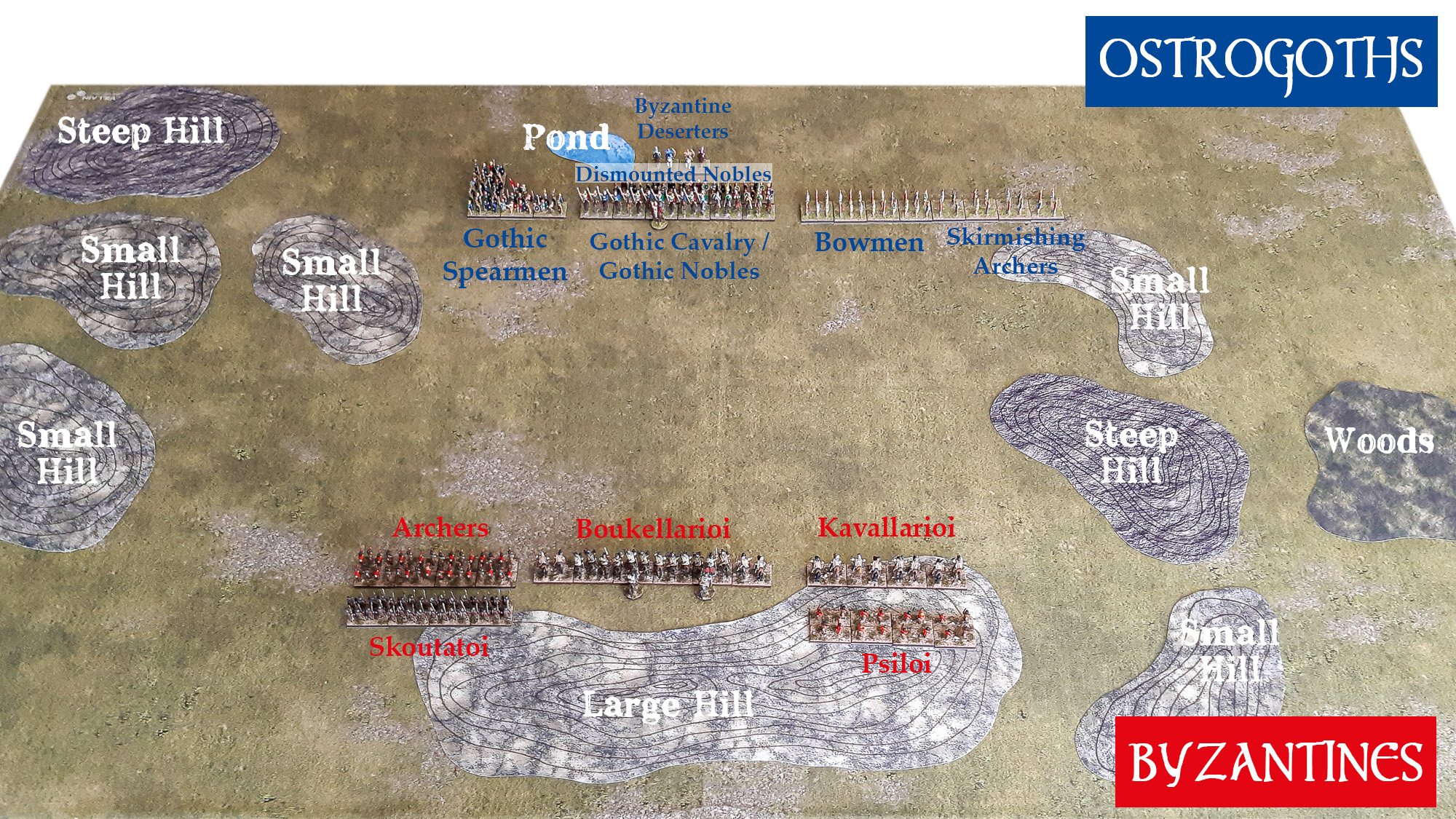 Der Würfel entschied, welche Armee auf welcher Seite Aufstellung beziehen würde: Das Heer der Ostgoten erhielt die obere Tischseite und würde als Verteidiger zuerst das Feld betreten. Anschließend würden ihre Kontrahenten, die Byzantiner, als Angreifer aufmarschieren.