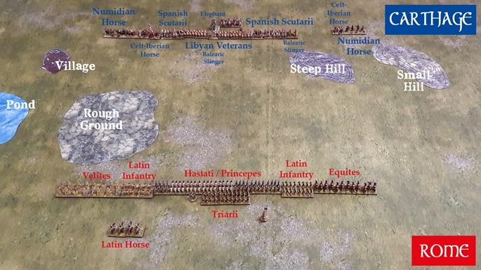 Jan stellte seine Karthager den Römern exakt vis-à-vis auf und nutzte dabei, ebenso wie die Römer, das offene Areal zwischen dem Gelände optimal aus. Die karthagische Gefechtsordnung gliederte sich in sechs Schwerpunkte: Der erste vorne links (aus Blickrichtung der Römer) bestand aus Lybischen Veteranen (Spears), zentral nahmen Afrikanische Elefanten (Elephants) Aufstellung, rechts daneben als ungestüm eingestufte Ligurier (Warband). Hinter den Lybiern positionierte sich die ebenfalls ungestüme Keltiberische Reiterei (Medium Horse), hinter den Elefanten stand die Numidische Reiterei (Light Horse). Ganz links, am Fuße des steilen Hügels, formierte sich eine kleine, aber aufgrund ihrer Fernkampfstärke gefährliche Abteilung Balearischer Schleuderer (Skirmishers).