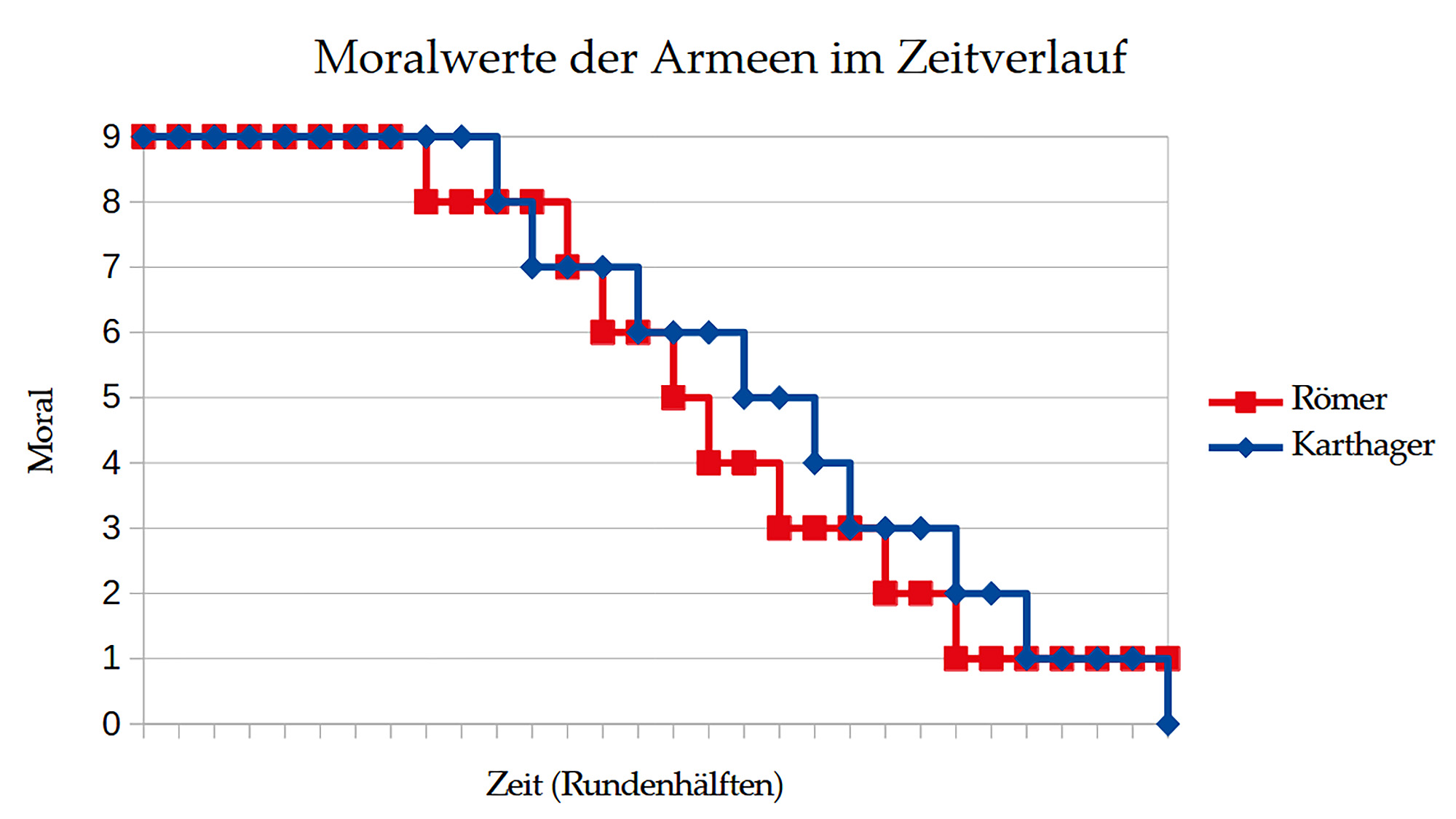Das Moraldiagramm zeigt die Moralwerte beider Armeen bei fortschreitendem Schlachtverlauf. Die Schlacht dauerte 15 Runden, jede Runde besteht aus einer römischen und einer karthagischen Hälfte, deshalb zeigt die X-Achse 30 Abschnitte. Das Kopf-an-Kopf-Rennen zeigt sich deutlich in den Kurven: Wann immer die Moral einer Armee sank, folgte der Moralverlust der anderen Armee kurz darauf, wobei auffällt, dass die Moral der Römer fast immer vor derjenigen der Karthager sank, während die Karthager nachzogen - bis auf die sechste und verhängnisvolle letzte Runde.