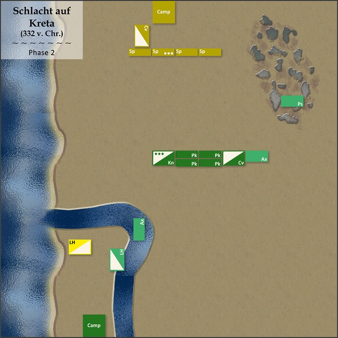 (1) Die verteidigenden Griechen wählten als Gelände eine Küstenlinie, die das Schlachtfeld verengte, sowie einen Fluss und einen Sumpf. Die Makedonen entschieden sich, von der Schlachtfeldseite mit dem Fluss aus anzugreifen, um den Griechen die Möglichkeit zu nehmen, ihre numerisch kleinere Armee hinter dem Fluss zu verschanzen. (Welcher sich jedoch nach dem initialen Würfelwurf sowieso als leicht durchwatbar erwies.) Die Griechen stellten ihre Truppen zuerst auf. Sie bildeten eine Linie, mit den Hopliten (Sp) im Zentrum (darunter ihr C-in-C), der leichten Kavallerie (LH) auf dem linken (hier und im Folgenden aus makedonischer Perspektive) Flügel und der regulären Kavallerie (Cv), in zweiter Reihe hinter den Fußtruppen, auf dem rechten Flügel. Die Makedonen stellten ihre Armee ebenfalls in einer Linie auf. Links außen, hinter dem Fluss, stand die leichte Kavallerie (LH), im Fluss selbst standen die Hypaspisten (Ax), daneben positionierte sich der C-in-C Alexander mit seinen "Gefährten" (Kn), gefolgt von der Phalanx (Pk) sowie auf dem rechten Flügel die Thraker (Ax) und die Plänkler (Ps).