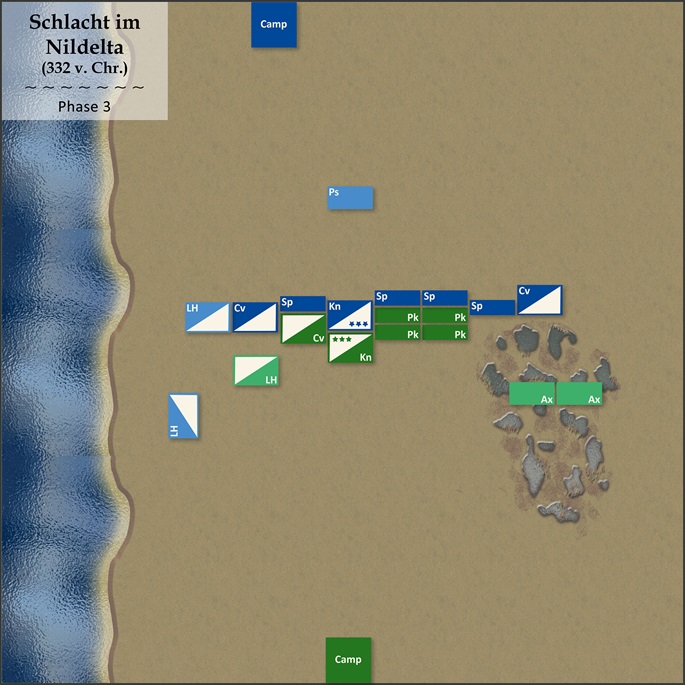 Doch kurz, bevor sich das Jahr 332 v. Chr. dem Ende entgegen neigte, mitten im Winter, setzte die makedonische Armee, die gerade im Herbst erst die griechische Rebellion niedergeschlagen hatte, übers Mittelmeer über und fiel ins Nildelta ein, wo eine persische Armee sich bereits zum Überwintern eingerichtet hatte! Ein überraschender und durchaus nicht risikoloser Schachzug, weil der winterliche Transport übers Meer eine erhöhte Gefahr des Verlusts von Elementen durch Havarie in sich birgt - aber der General der Armee, MacGuffin, ging dieses Risiko ein und die Armee überstand die Reise tatsächlich unbeschadet. So wird es nun zu einer Schlacht zwischen der makedonischen Armee, bestehend aus 9 Elementen, und der persischen Armee, bestehend aus 11 Elementen kommen. Eine schwere Aufgabe für die makedonische Generalität, wenngleich (das nötige Glück vorausgesetzt), nicht unlösbar! Da die Zeit an dem Sonntag aber bereits weit vorangeschritten war, wurde die Entscheidung auf das nächste Mal vertagt. Einen dramatischeren Cliffhanger für diesen Spieltag hätte man sich nicht wünschen können.