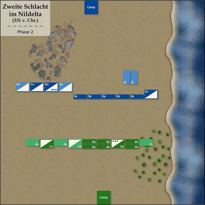 Der Frühling 331 v. Chr. sah - neben einigen kleineren, vorbereitenden Truppenverlagerungsaktionen, deren Folgen sich im Laufe des Jahres erst zeigen würden - als einzige nennenswerte Aktion das erneute Übersetzen einer 12 Elemente starken makedonischen Armee von Kreta aus ins Nildelta. Da sie dort von einer ebenfalls aus 12 Elementen bestehenden Armee der Perser erwartet wurde, kam es dort abermals, wie im Jahr 332 v. Chr., zu einer Schlacht. Aus makedonischer Sicht war dieser andauernde Druck auf die Perser mittels einer zweiten, südlichen Front sicherlich eine nachvollziehbare strategische Option, bedauern war aus ihrer Sicht einzig, dass sie den operativen Fehler begangen, ihre Armee zuvor nicht wenigstens so weit aufzurüsten, dass sie den Persern dieses Mal numerisch überlegen sein würden. So aber resultierte eine chancenmäßig ausgeglichene Schlacht, was den Persern abermals die Möglichkeit eröffnete, den makedonischen Vorstoß zurückzuschlagen.