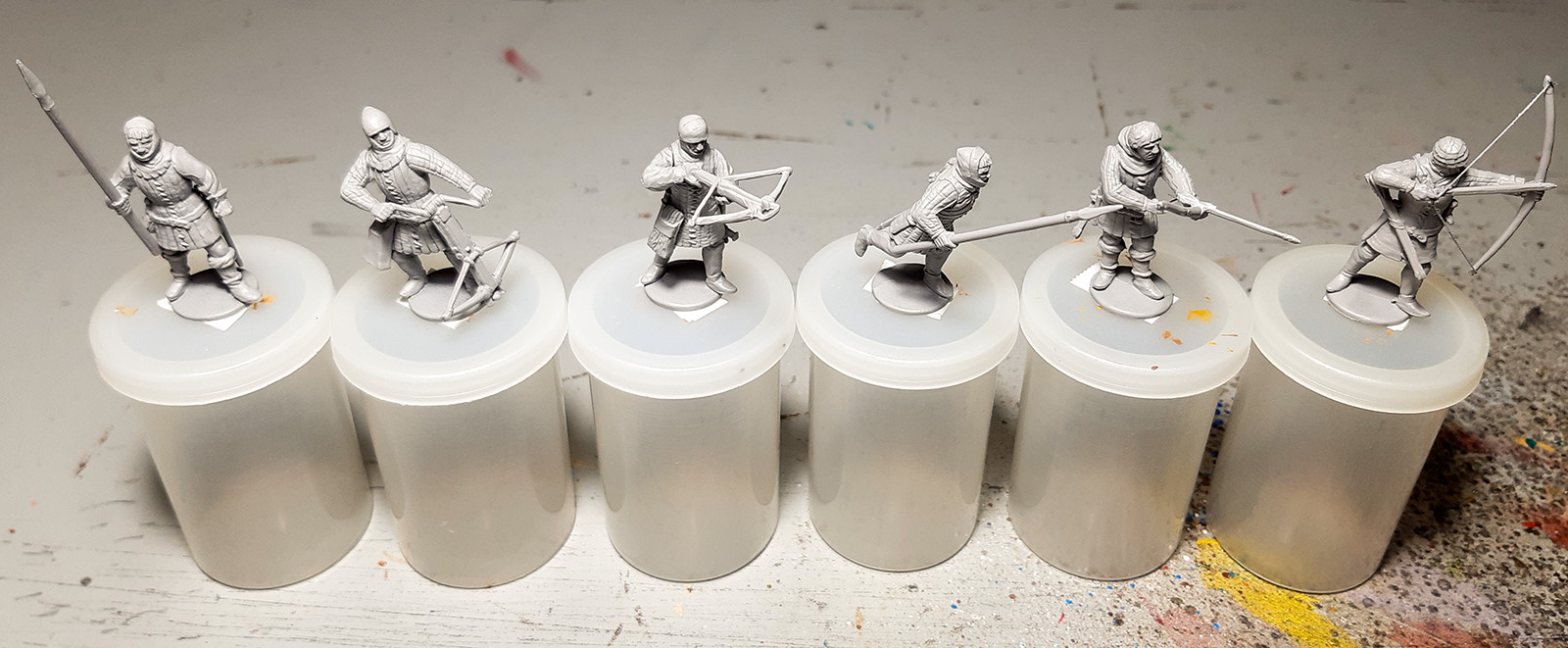 Das Projekt schritt gut voran. Als erstes wurden die Crossbowmen fertig (auf dem Foto noch ohne Wash und Basierung):