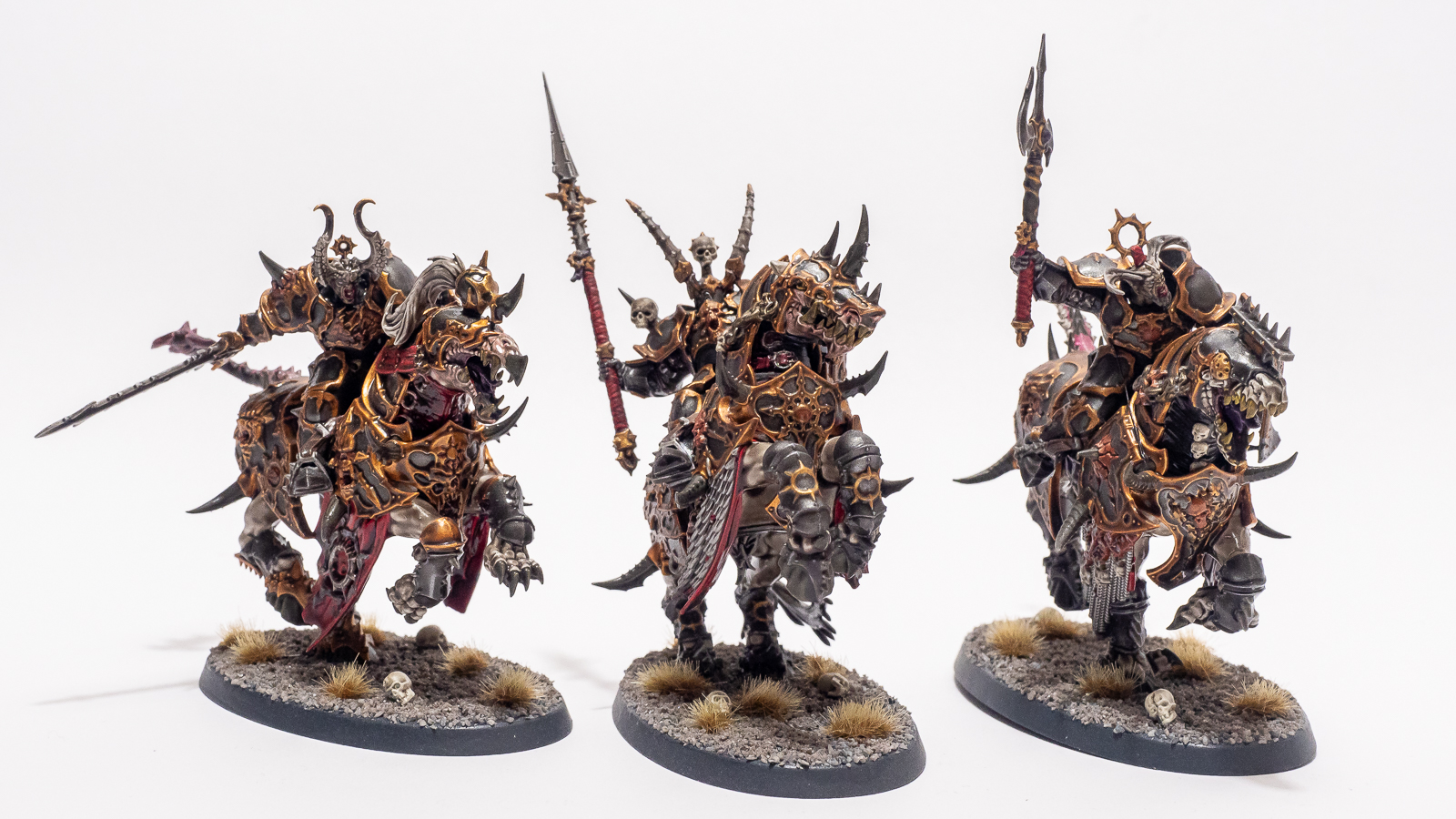 Viele Krieger der Sklaven der Finsternis tragen verzierte Plattenrüstung und sind mit einer Vielzahl tödlicher Waffen wie Hellebarden, Hämmer, Äxte, Streitkolben und Schwerter ausgestattet. Einige von ihnen reiten auch auf mutierten Rossen oder gar Echsenmonstern in die Schlacht. Meine Kriegerschar befindet sich noch im Aufbau und wird sukzessive vervollständigt...