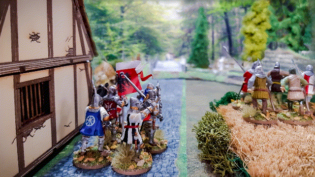 Die Hanauer Fußtruppen näherten sich vorsichtig den Frankfurtern, denn sie wussten, dass die Armbrustschützen ihrer Feinde einen weiten Bereich kontrollieren konnten (15). Die Kronberger Armbrustschützen stellten sich hinter einem der Häuser auf, wo sie gut geschützt waren und das Zentrum sowie die rechte Seite der Frankfurter gut im Blick hatten (16).